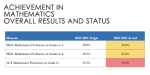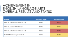 Staff reviewed student achievement progress and results from the 2022-23 school year. The District saw a year-over-year decline, and staff identified ongoing post-pandemic learning gaps, funding levels, and delays in curriculum approval from the State as exacerbating factors.