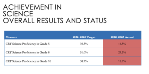 - In Grades 5, proficiency rates as measured by the Criterion-Referenced Test (CRT) in science was 16.5% for the 2022-23 school year. This is a decrease from 2018-19’s proficiency rate of 22.7%. These results also demonstrate ongoing disparities among different student groups.