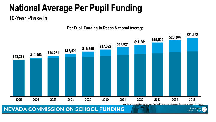 The Commission also presented a 10-year phase-in on per-pupil funding and comparison to the national average. See below: