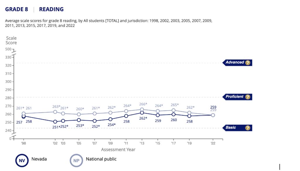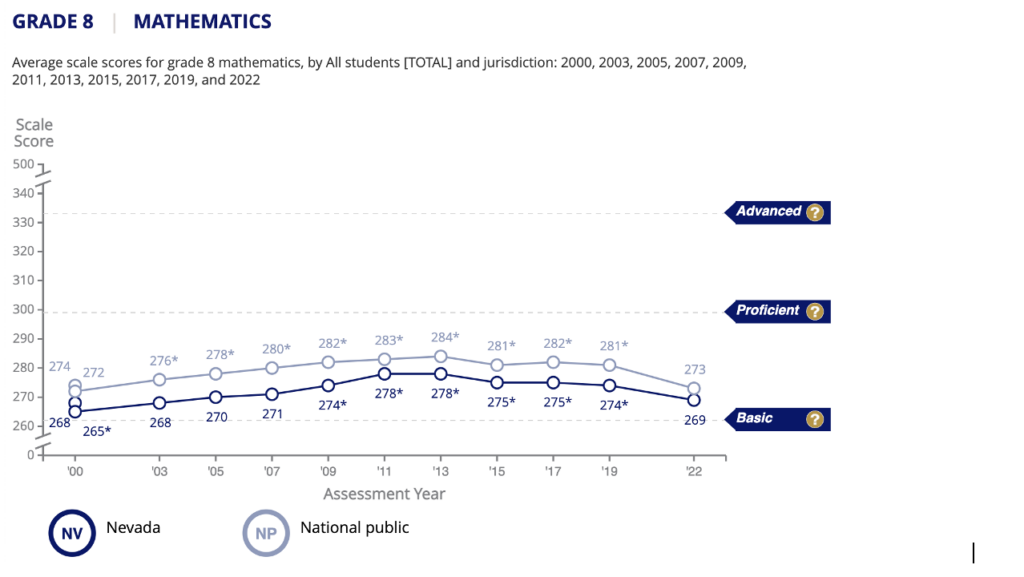 Eighth grade scores provide a similar picture. The average Nevada student is just barely above basic proficiency in math, at numbers reflecting a nearly 20-year slide in achievement, but also reminding us that in the history of NAEP, Nevada students have never persistently performed as well as the national average. These are the students who will be transitioning into college and the workforce in just four (4) short years.